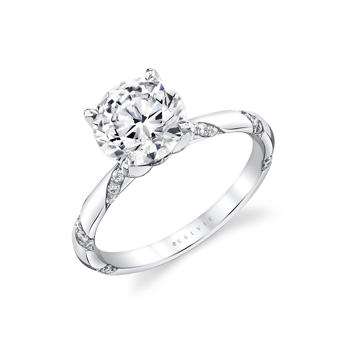 14k white gold ring mounting with .18ct diagonal striped diamond shank and 2ct 4-prong head, Size 6.5 (center stone not included)