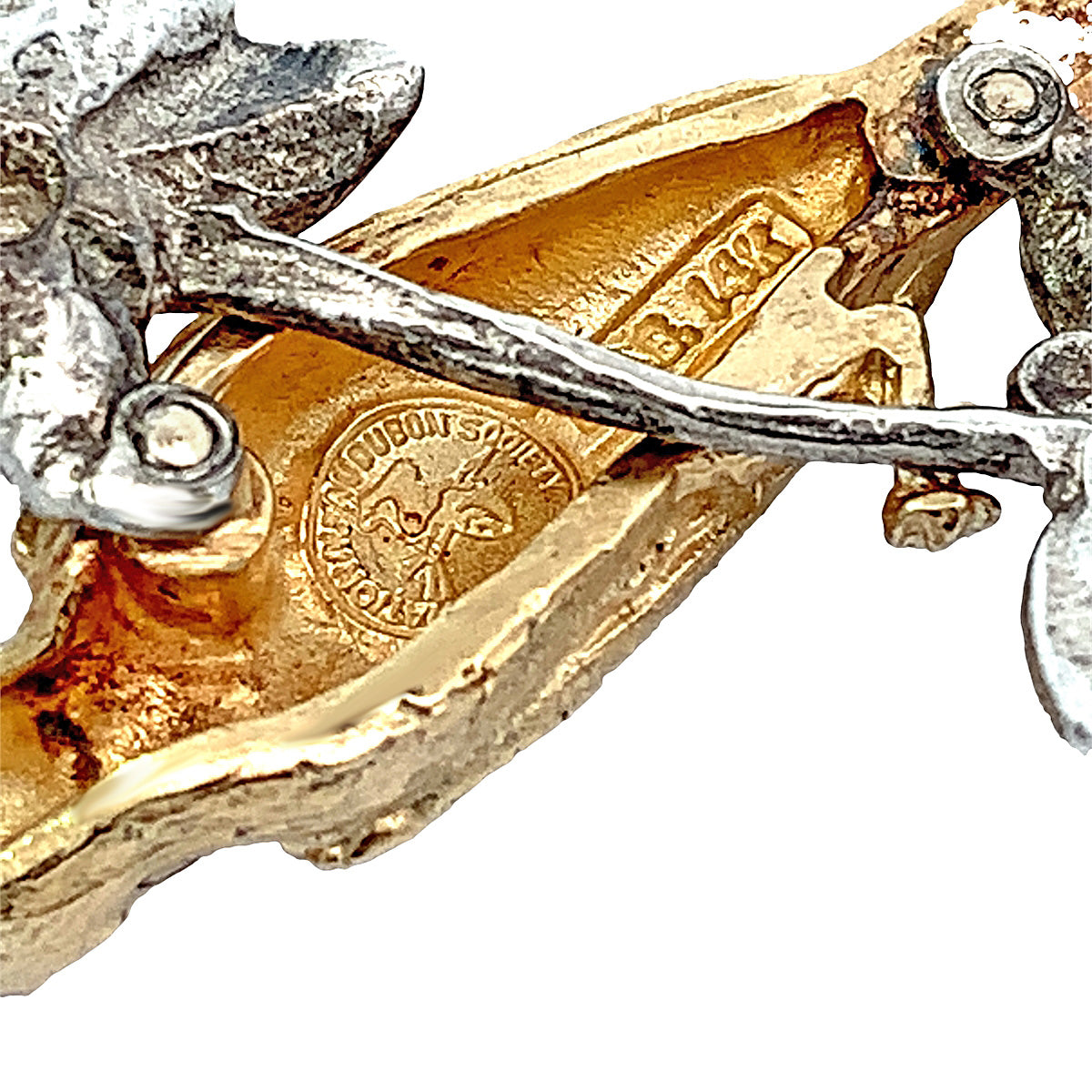 Very unique 14kt yellow gold Fork Tail Flycatcher bird pin with silver flowers, issued by the "National Audubon Society"