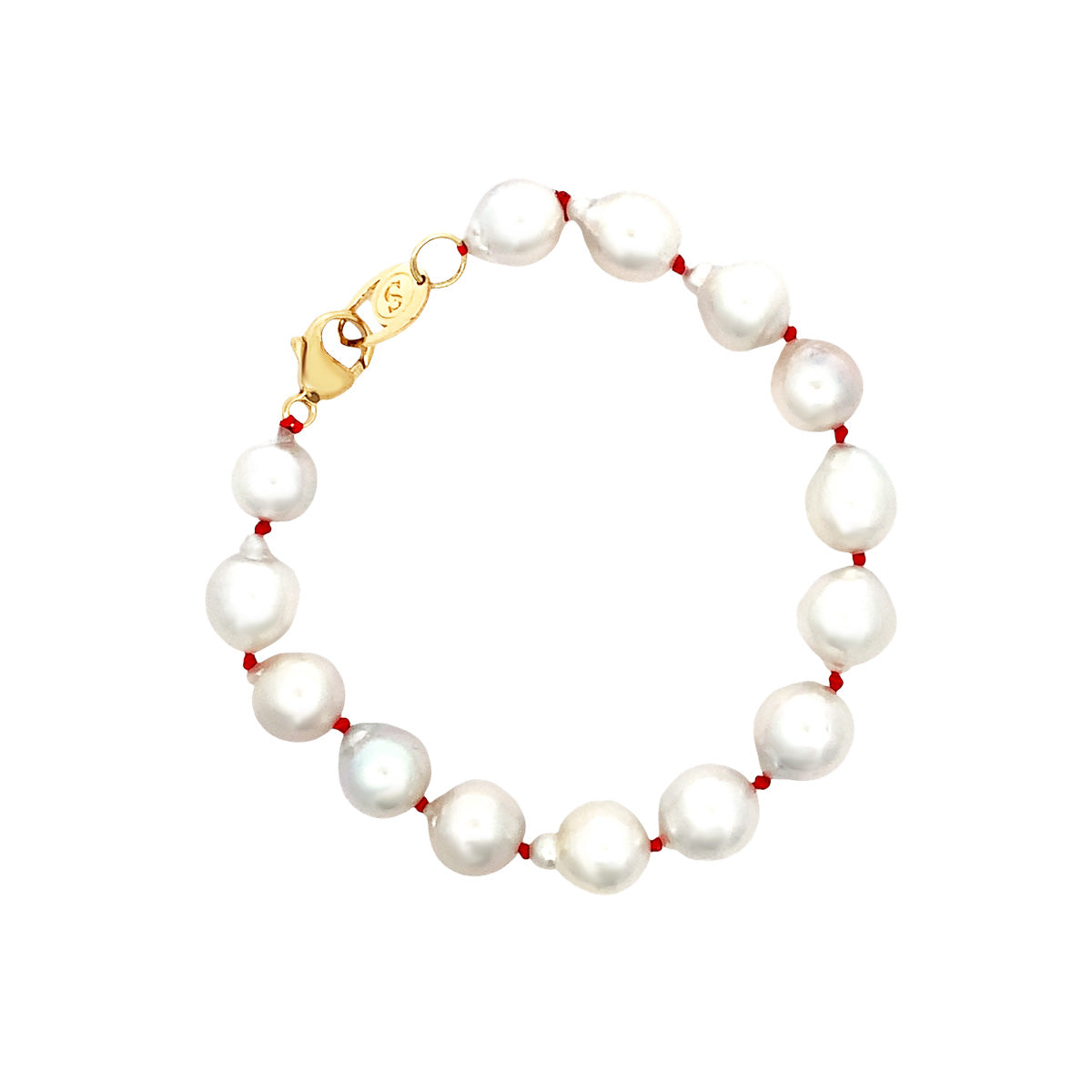 14kt yellow gold bracelet of 9-10mm Baroque South Sea pearls with vivid red knots. Add a little fun color to the classic pearl bracelet!