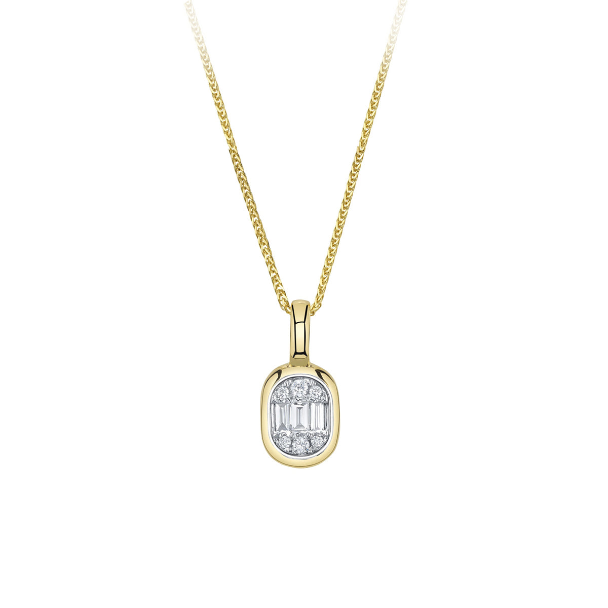 14k yellow gold 18" tiny "Icon Lumeria" 0.10ct baguette & round diamond "Chopin" pendant by Shy Creation