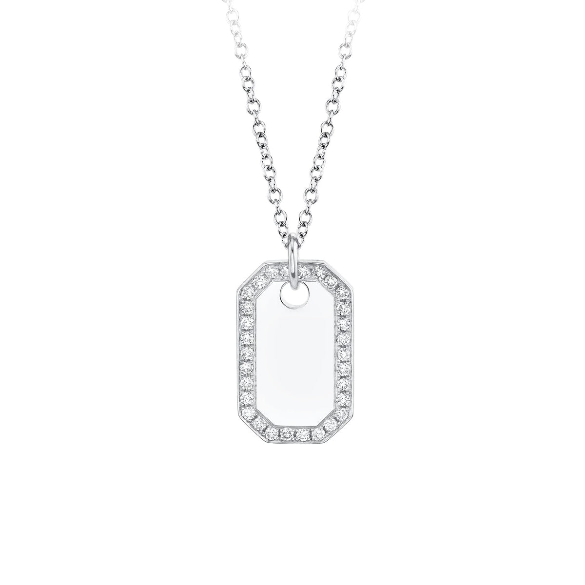 14k white gold 18" shiny hexagonal oblong tag pendant by Shy Creation with 0.40ct diamond frame