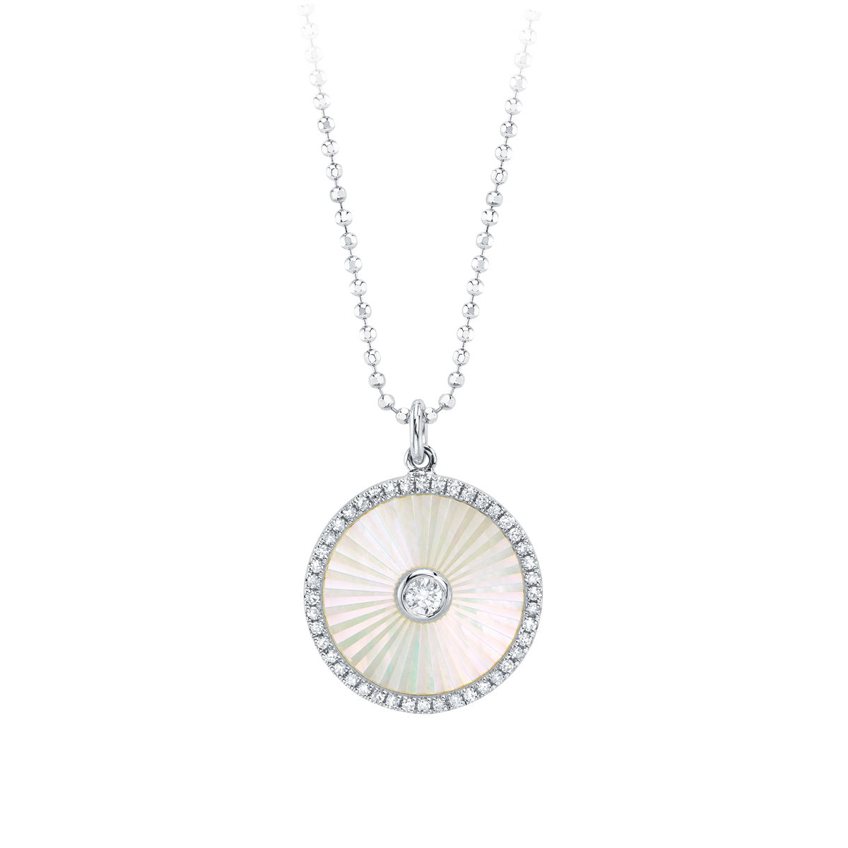14k white gold 18" small fluted mother-of-pearl disc pendant with 0.18ct diamonds