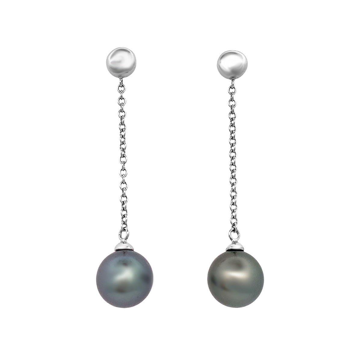 14kt white gold 1.75" long chain drop earrings with 9.75mm Tahitian pearl bottom