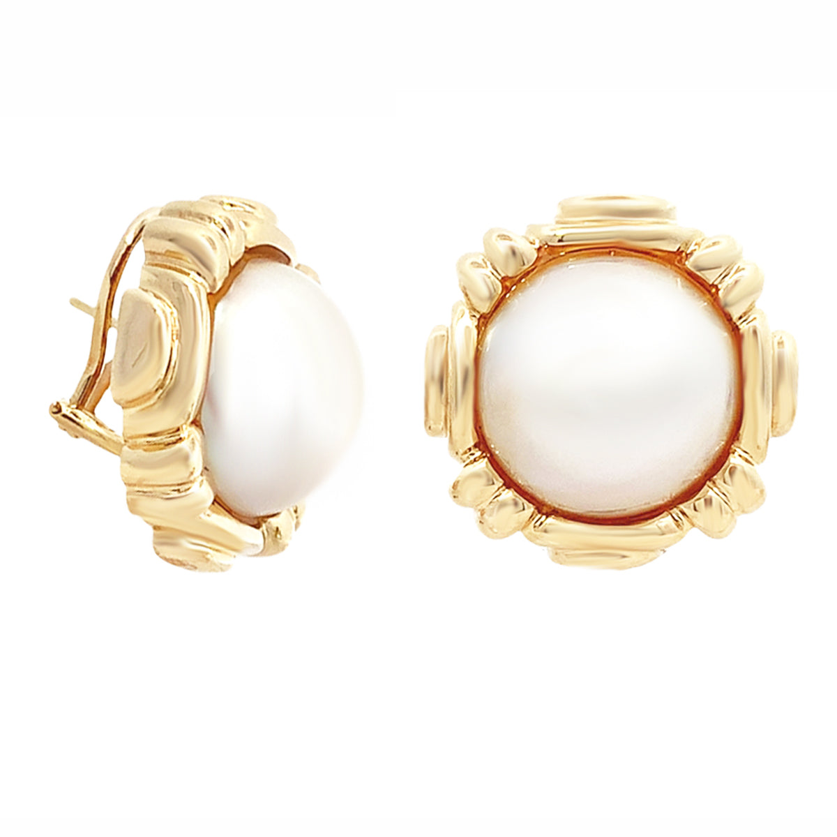14k yellow gold large, heavy Vintage mabe pearl button earrings with fancy gold frame
