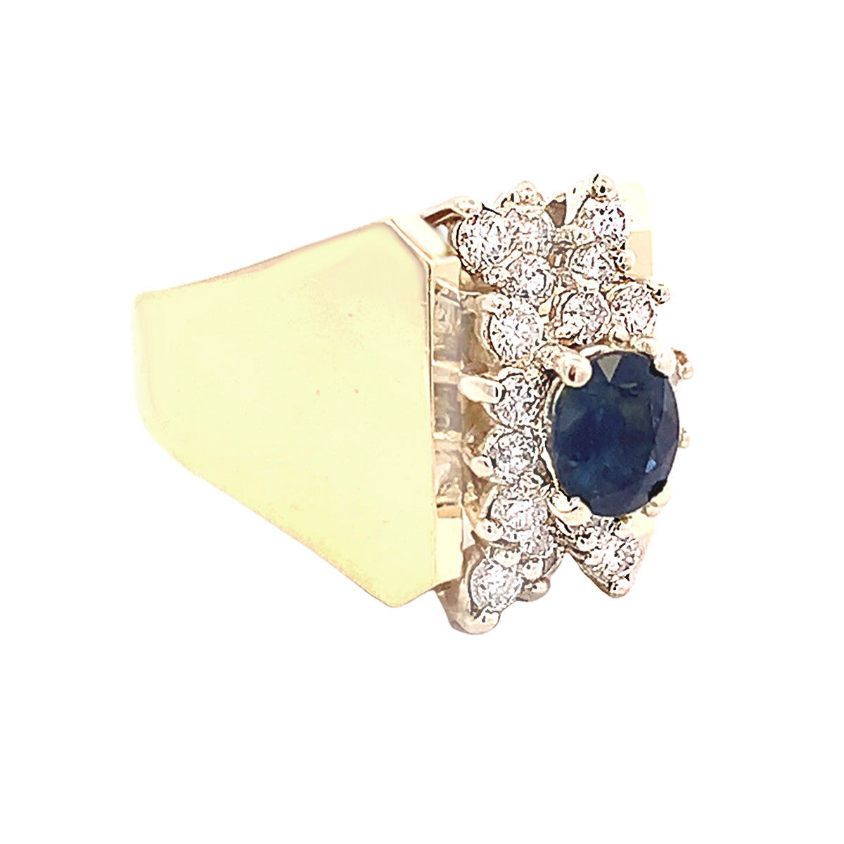 Bold 14k yellow gold wide tapered Vintage ring with oval sapphrie & 0.60ct diamond center cluster, size 7
