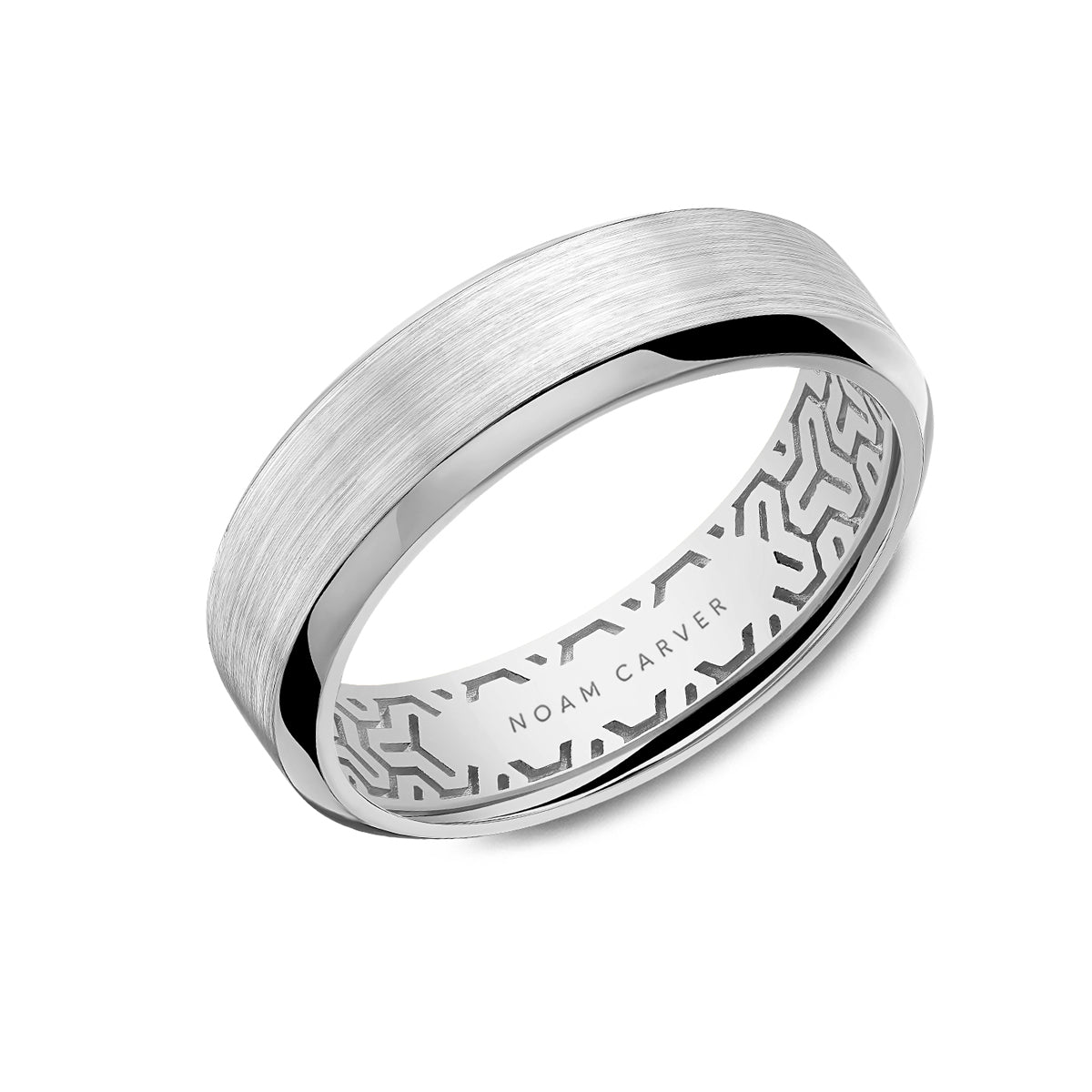 14k white gold 6.5mm flat sandpaper finish wedding band with shiny beveled edges & "Y" pattern interior, size 10