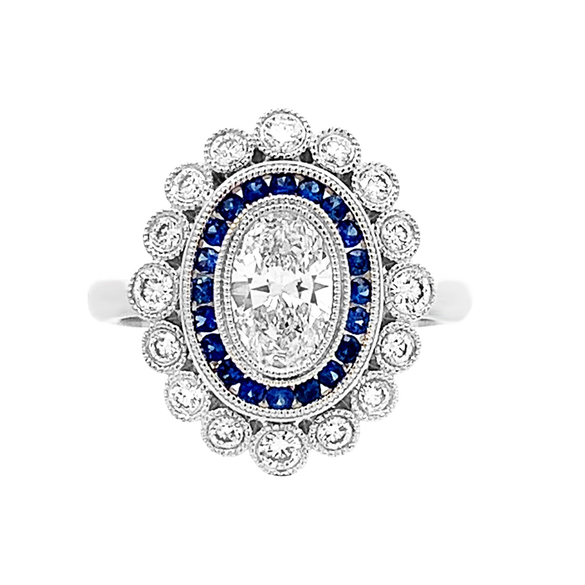 14kt white gold Edwardian-inspired ring with 1.21ct diamonds (oval center) & tiny round sapphires, size 6.5. The milgrain trimmed scalloped halo adds romance to this gorgeous piece that looks like to was made around 1900-1915, instead of today!