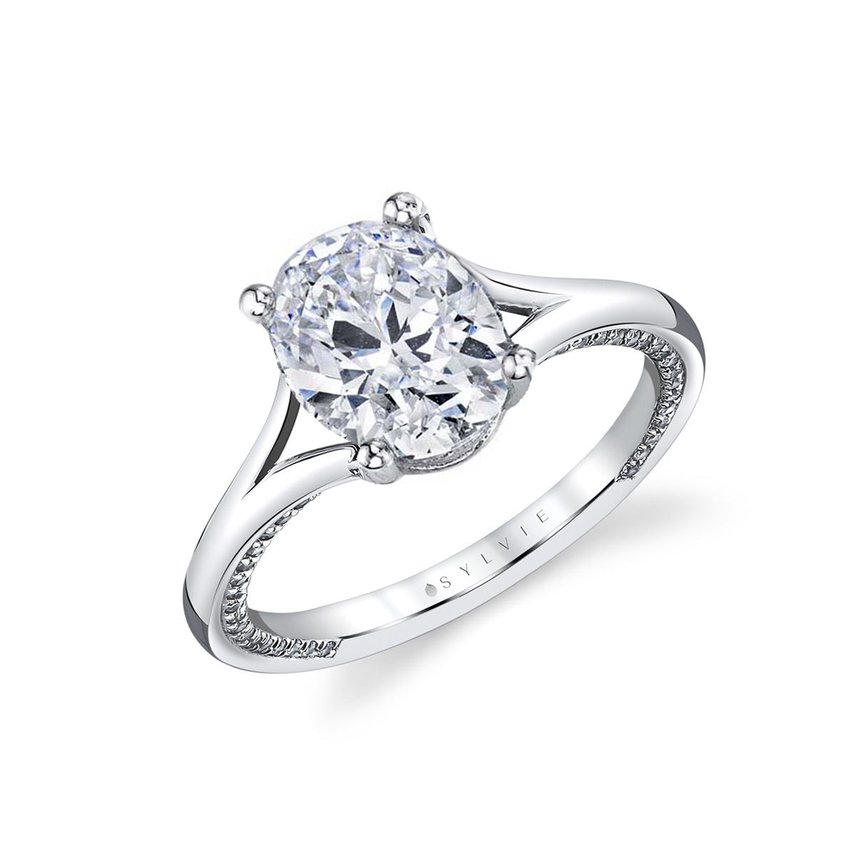 14k white gold split shank ring mounting with 0.24ct diamond side shank and 4-prong white 2ct oval head, size 6.5 (center stone not included)