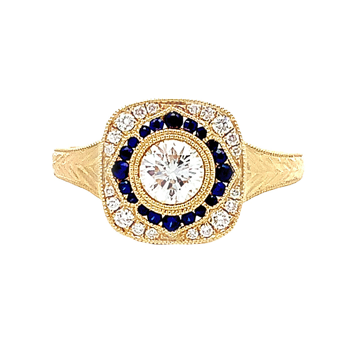 14kt yellow gold Edwardian-inspired ring with 0.55ct diamonds & tiny round sapphires, size 6.5. With a design that is straight out of 1900-1915, this new ring makes a unique statement for anyone. Ring shank is hand engraved all around. Center diamond is GIA certified.