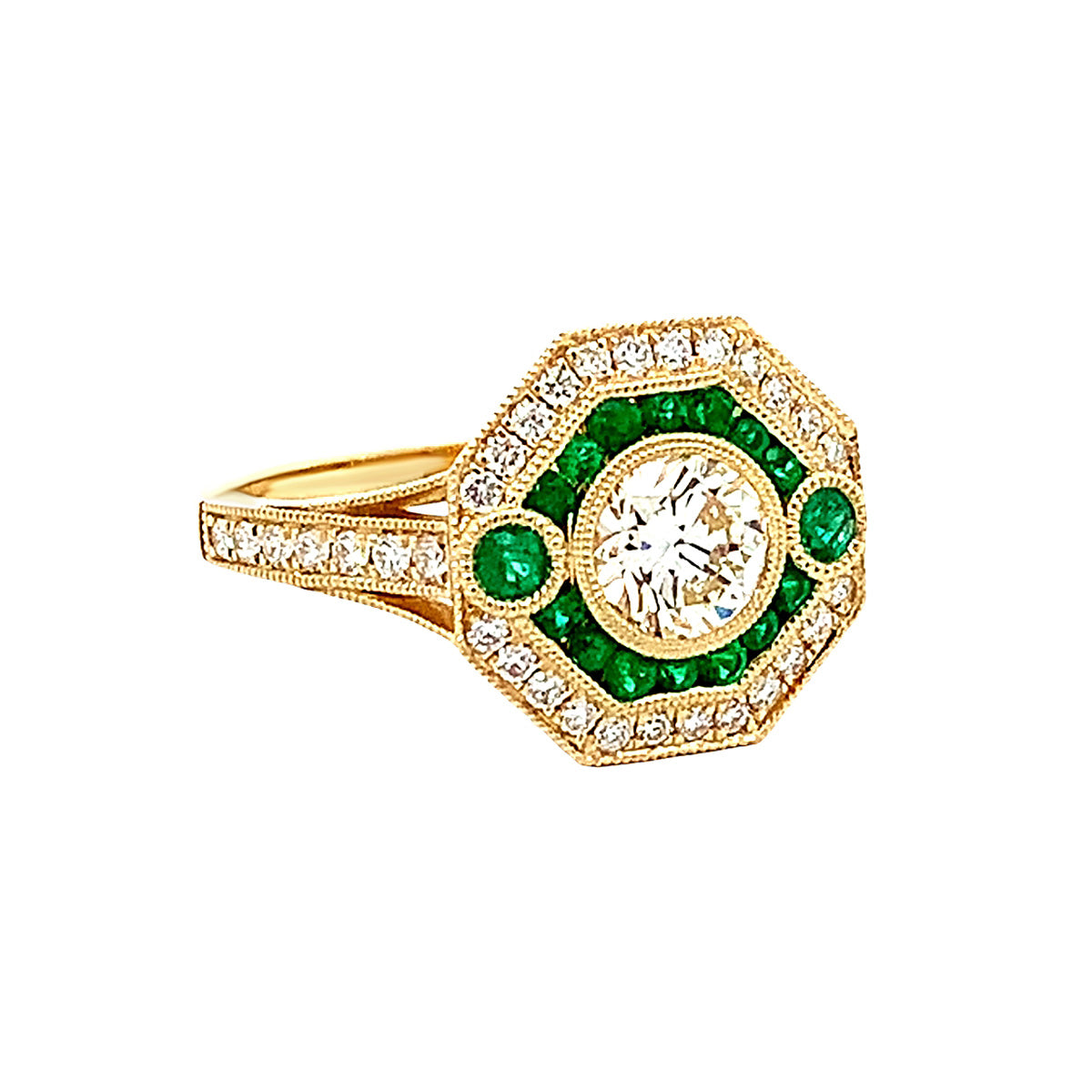 14kt yellow gold stunning Deco-inspired ring with 0.97ct diamonds & tiny round emeralds, size 6.5. The Geometric design and milgrain trim look straight out of the Flapper era fashions. Center diamond is GIA certified.