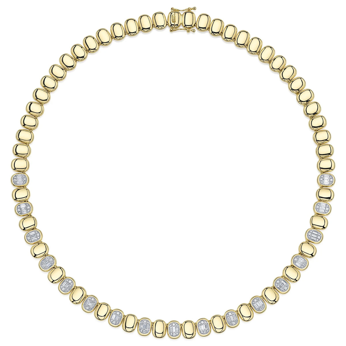 14k yellow gold 17" fabulous pillow link "Icon Lumeria" necklace by Shy Creation with 1.70ct baguette & round diamonds in 17 stations