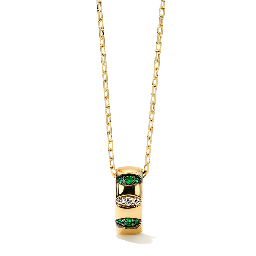 18k yellow gold 18" sleek "Guardian" barrel pendant by Mark Henry with emeralds & 0.03ct diamond cluster stripes