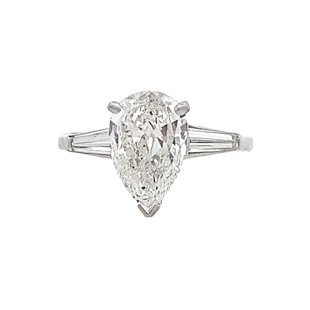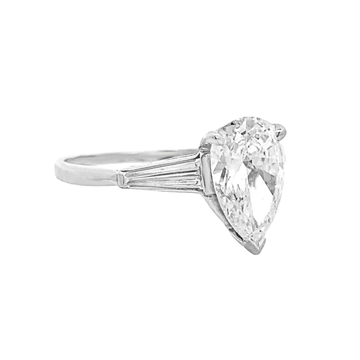 Vintage 3-stone platinum 1.90ct pear engagement ring with 0.25ct baguette side diamonds, size 6.75
