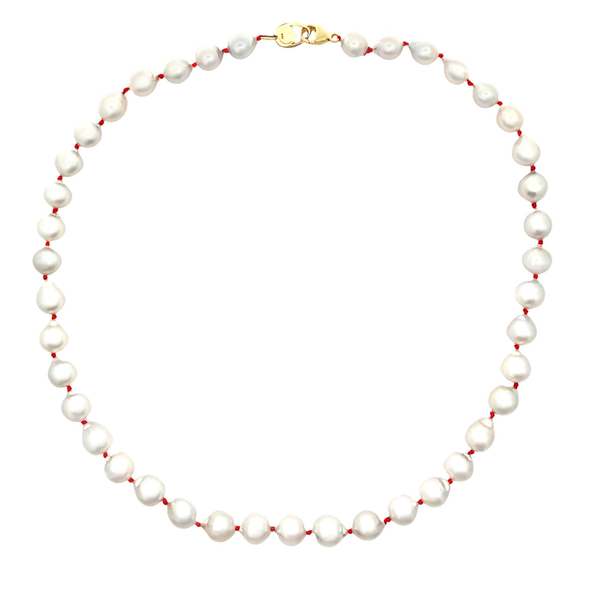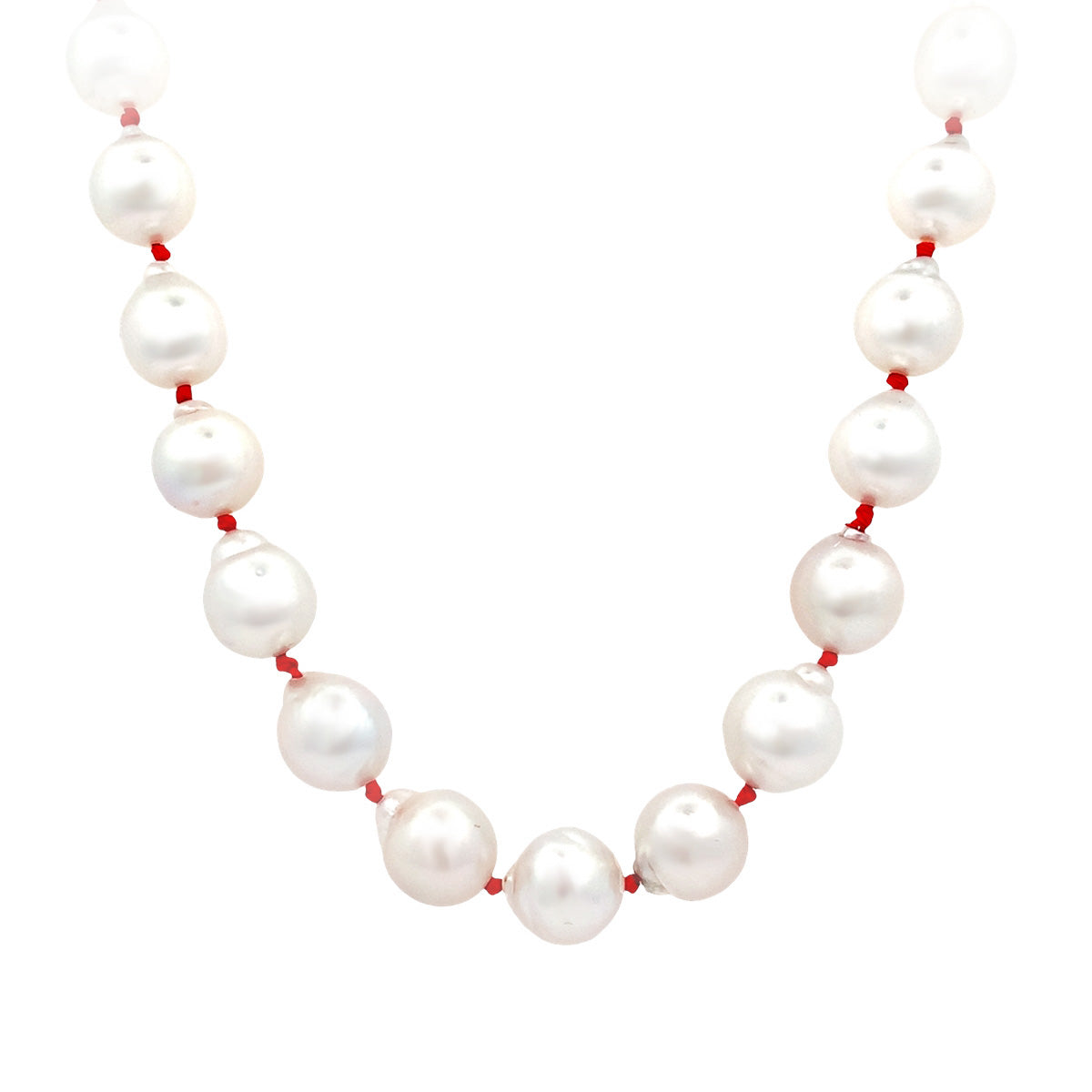 14kt yellow gold 19" strand of 9-10mm Baroque South Sea pearls with vivid red knots. What a charming way to add pizazz to the classic pearl strand.