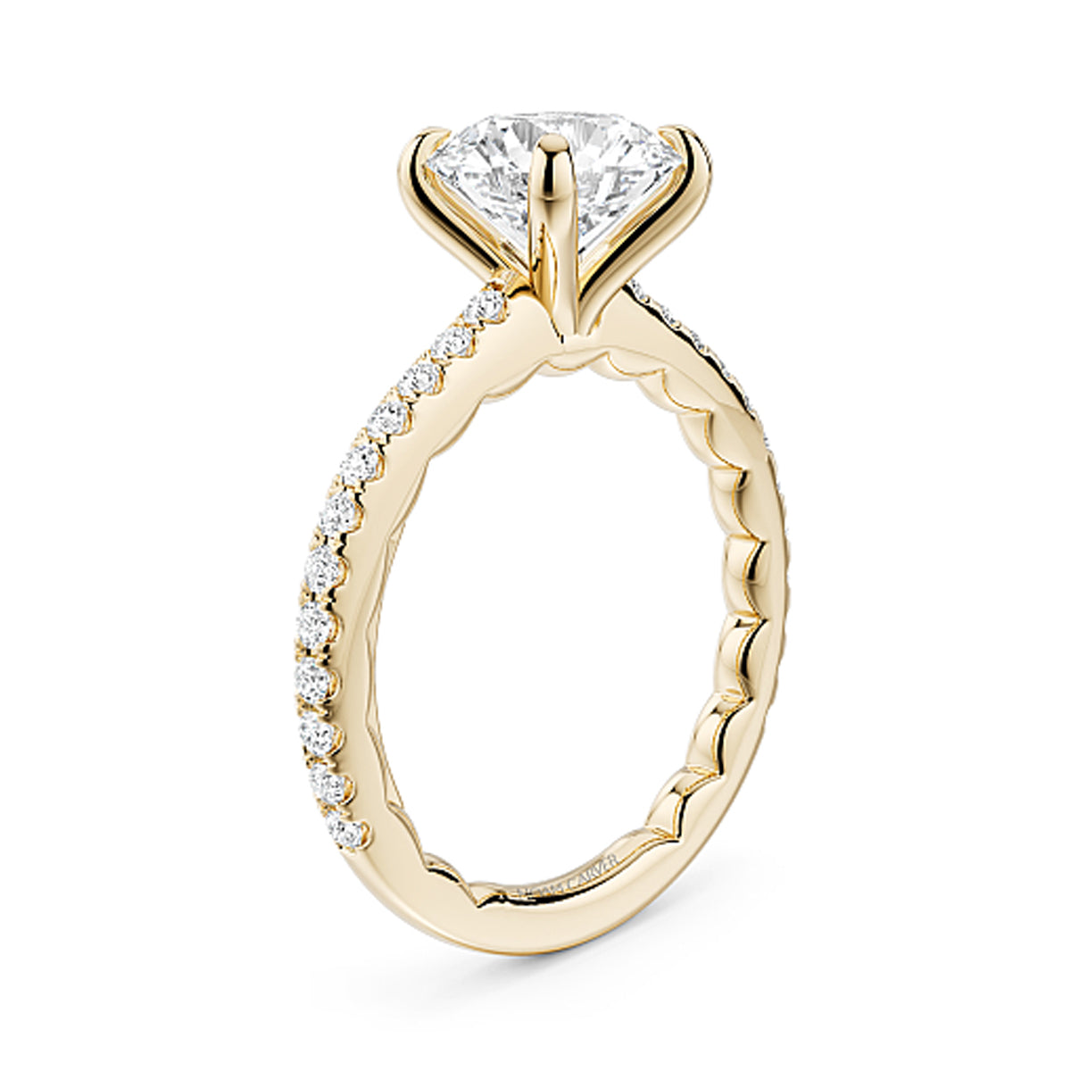 14k yellow gold engagement ring mounting (2ct round) with 0.34ct diamond shank, "Luna" by Noam Carver, size 6.5 (scalloped inside shank)