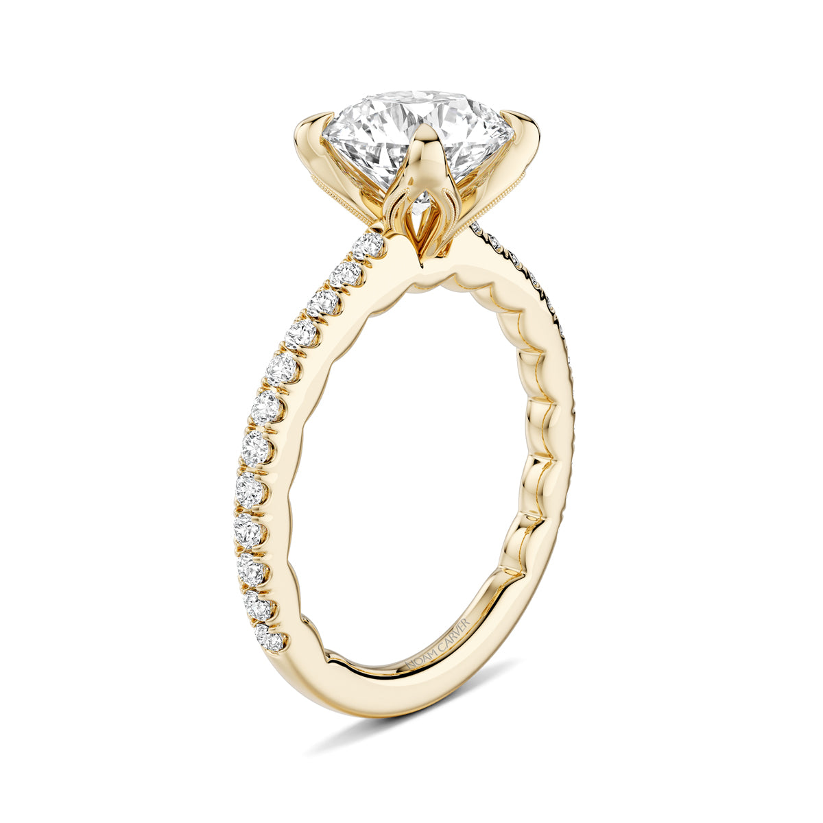14k yellow gold engagement ring mounting (2ct round) with 0.34ct diamond shank, "Luna" by Noam Carver, size 6.5 (scalloped inside shank)