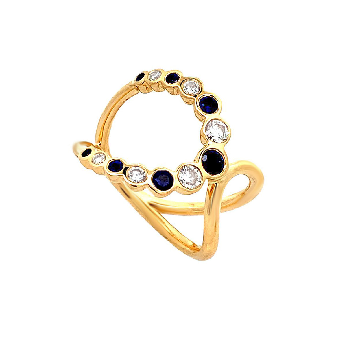 18k yellow gold double loop 0.39ct sapphire & 0.29ct diamond ring by Mark Henry, size 6.25