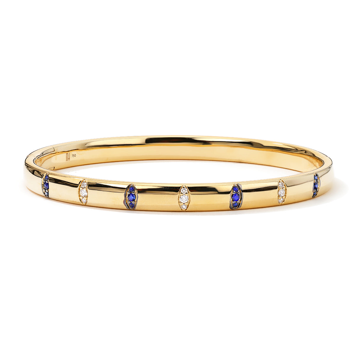 18k yellow gold sleek "Guardian" pave bangle by Mark Henry with sapphire & 0.07ct diamond cluster stripes