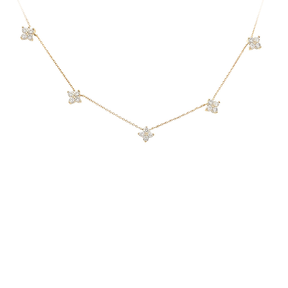 14k yellow gold 18" 3/4ct necklace with 5 diamond "star" cluster stations