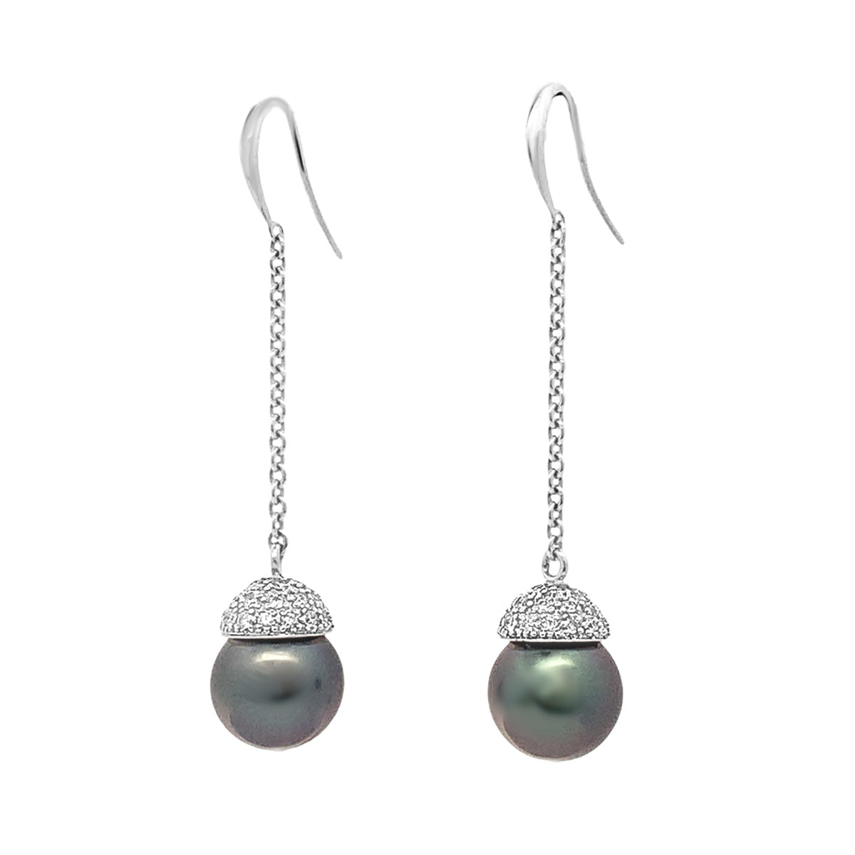 18kt white gold 1.75" long 11mm Tahitian pearl drop earrings with 0.60ct pave diamond caps