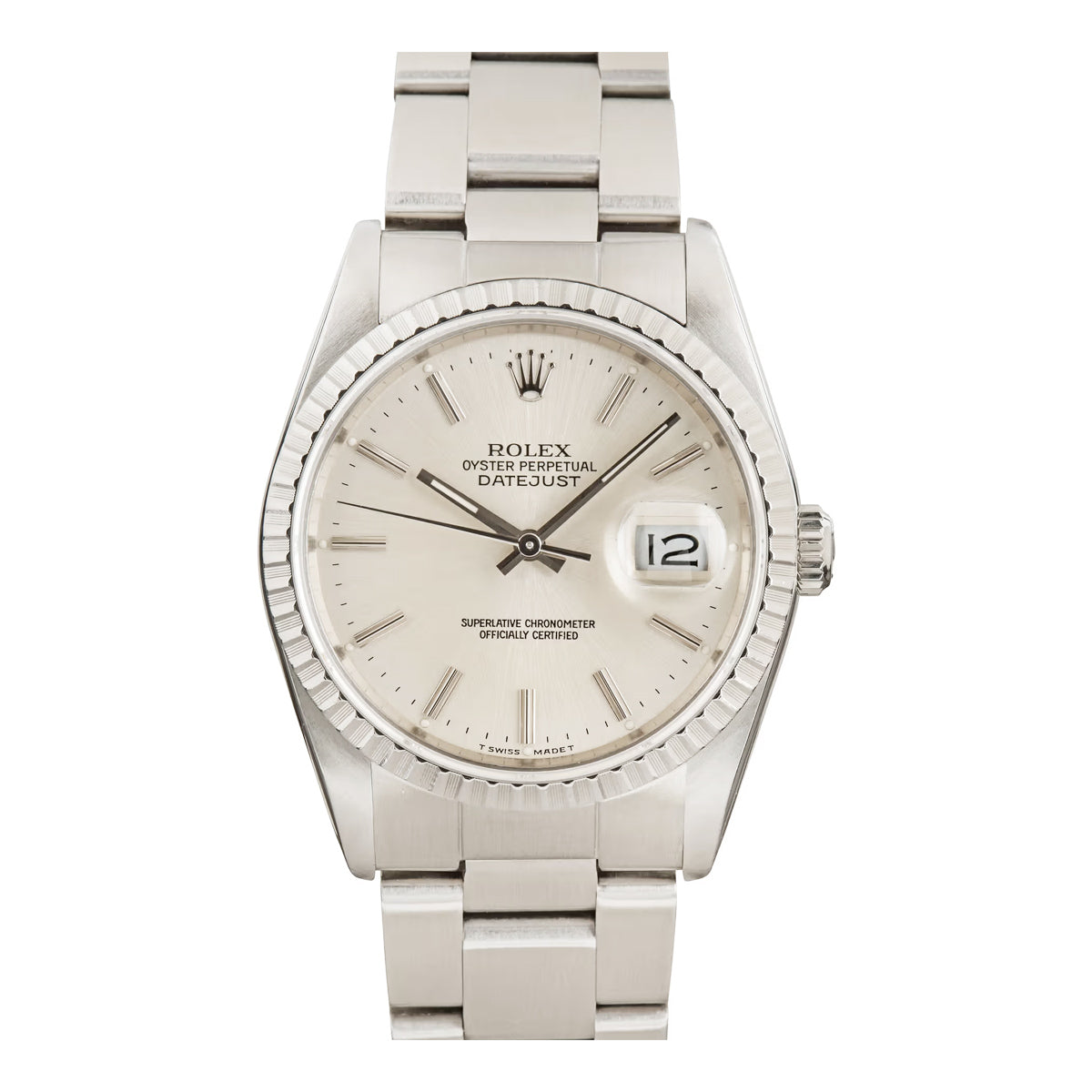 Steel 36mm Rolex Datejust with silver dial, engine-turned bezel & Oyster bracelet, circa 1986