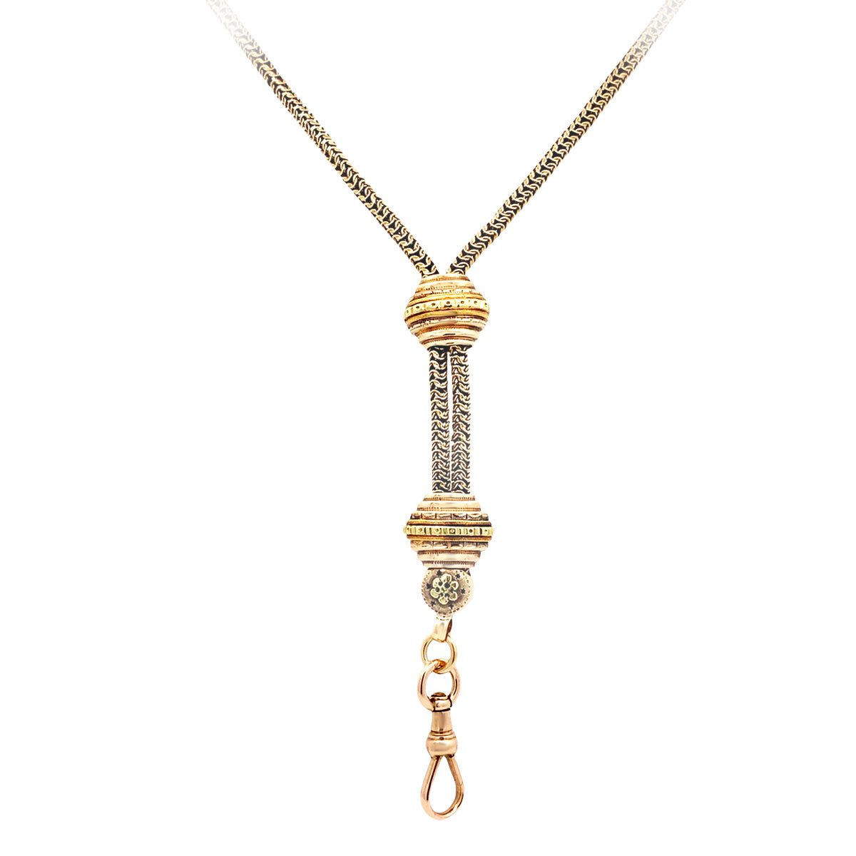 14kt yellow gold 22" Vintage "Y" chain with moveable slide and clip for pendant, made from an Antique pocketwatch chain. Most pendants, charms or pocket watches can be attached at the bottom clip. The top slide moves up & down to adjust the "Y".