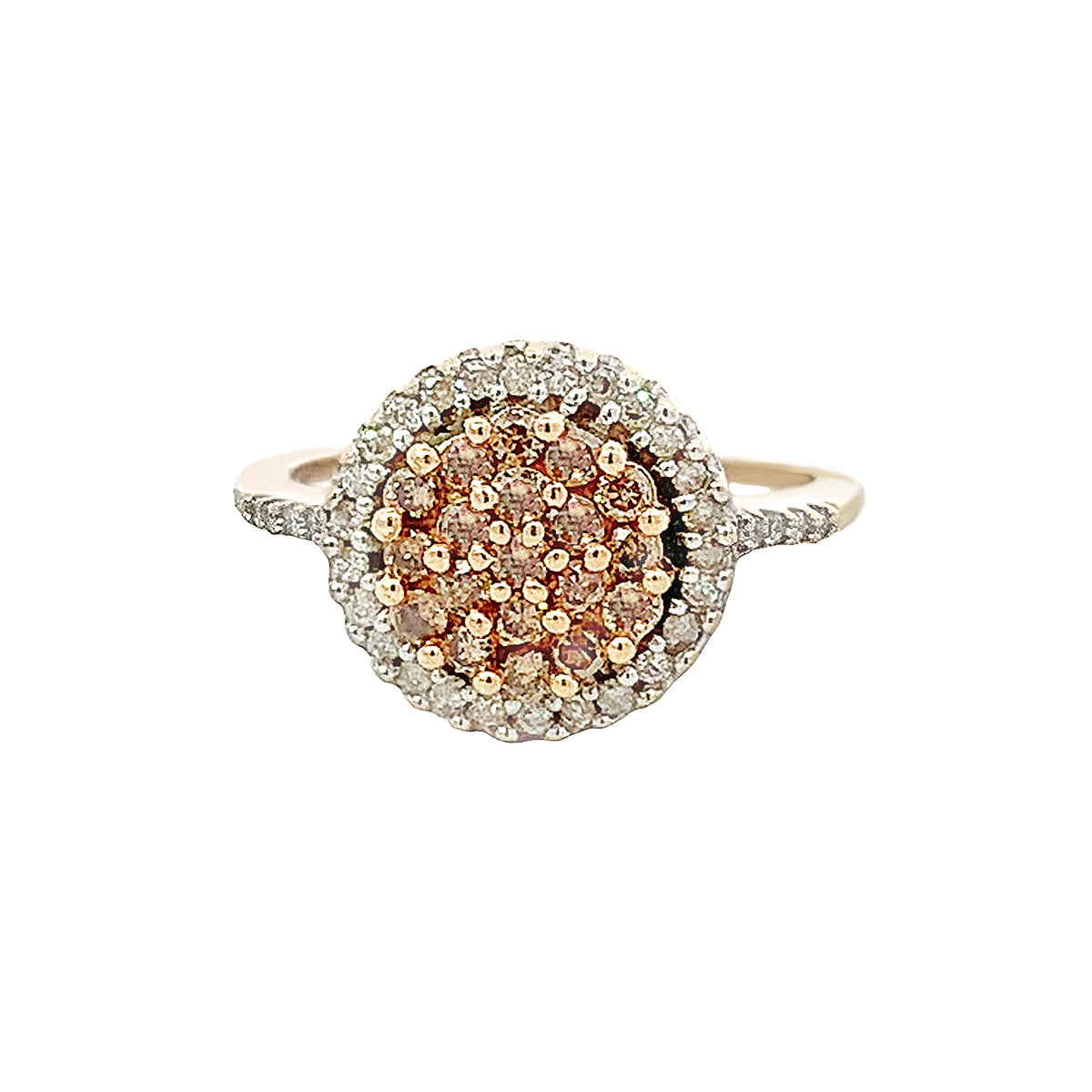 10kt yellow gold Vintage 0.54ct chocolate & white diamond round cluster ring, size 8