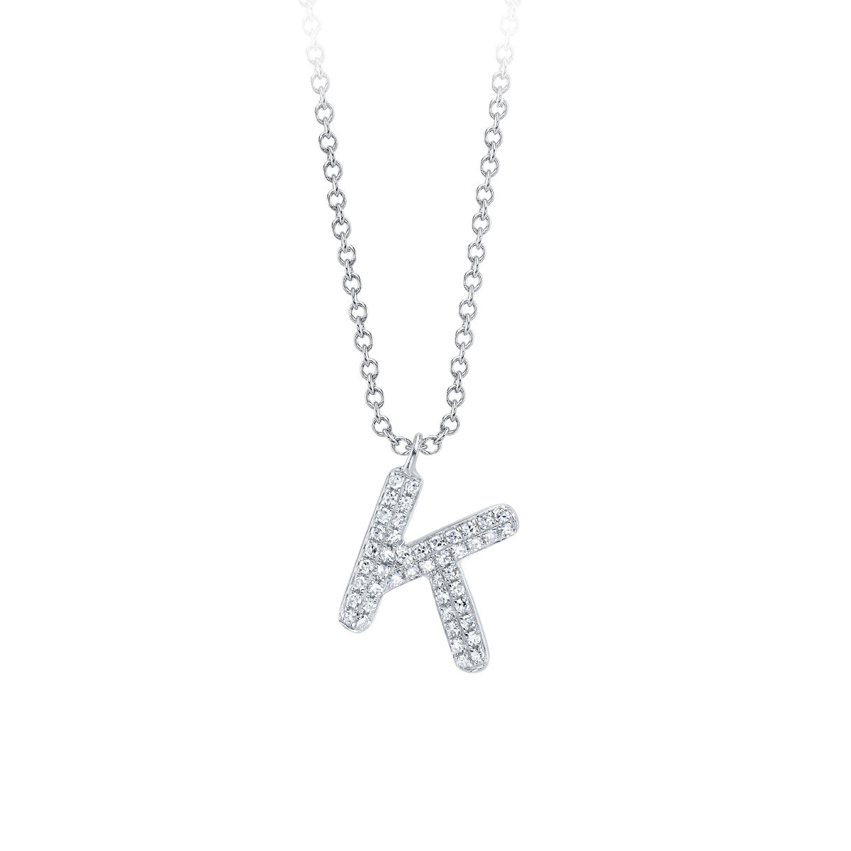 14k white gold 18" 0.10ct pave diamond block initial pendant "K"
