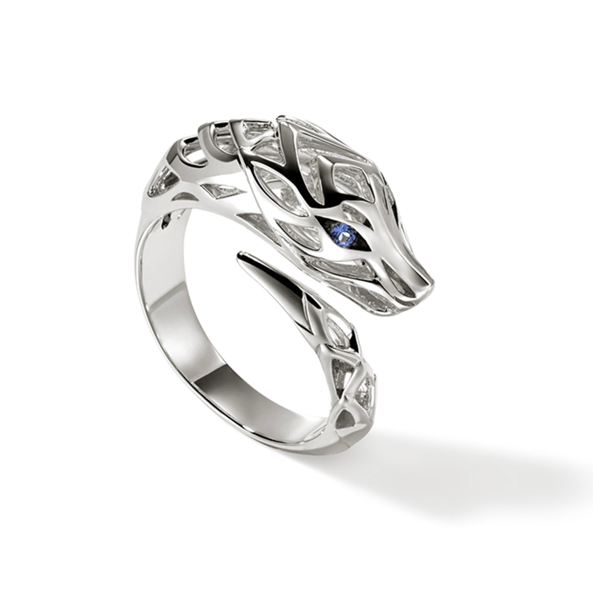 Sterling silver John Hardy "Naga Heritage" dragon tail ring with blue sapphire eyes, Size 7