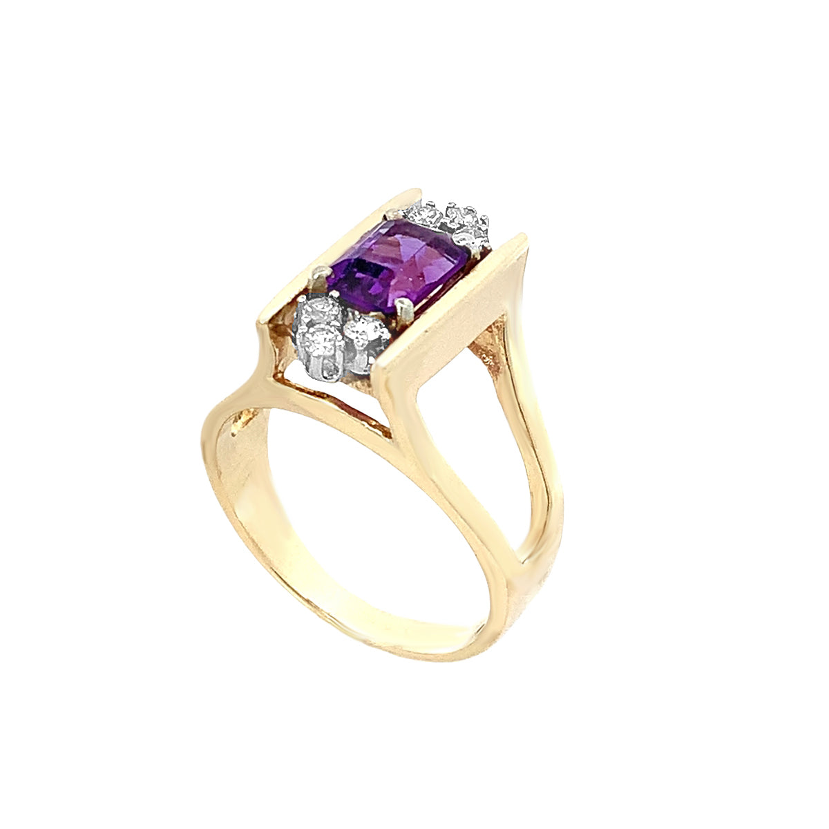 14kt yellow gold Vintage Modernist amethyst & 0.15ct diamond ring, size 6.25