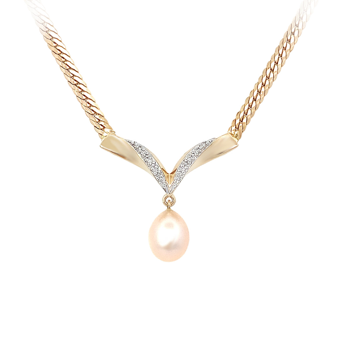 14k yellow gold 17" Vintage "V" necklace with delicate "peach" colored Freshwater pearl drop & 0.02ct diamonds