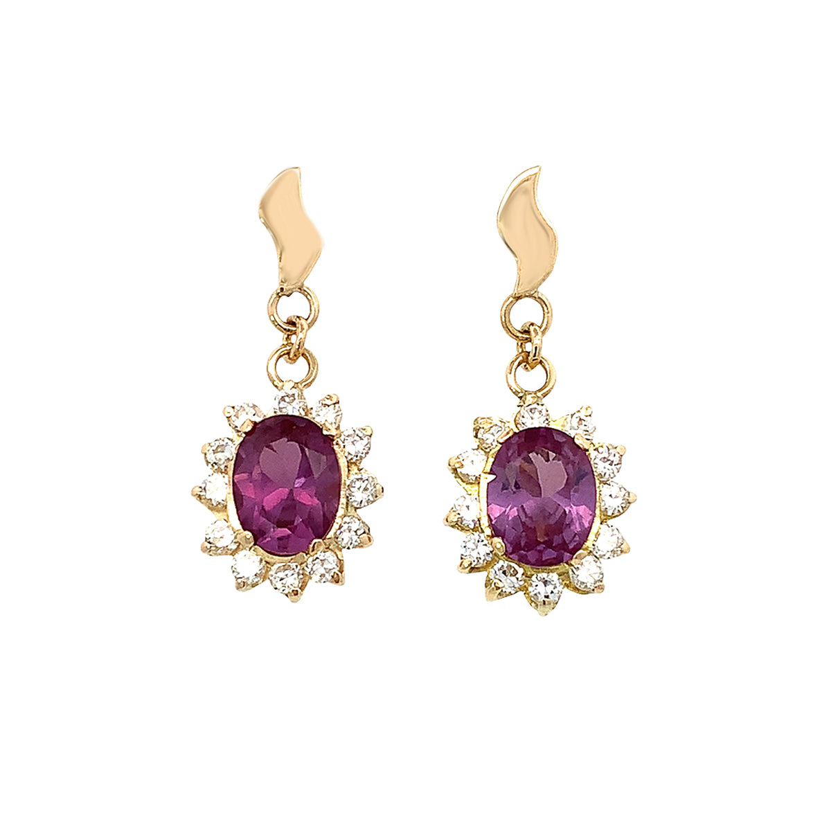 18kt yellow gold Vintage synthetic color-change sapphire drop earrings with white sapphire halos. Color-change synthetic stones are meant to simulate gemstones like alexandrite.