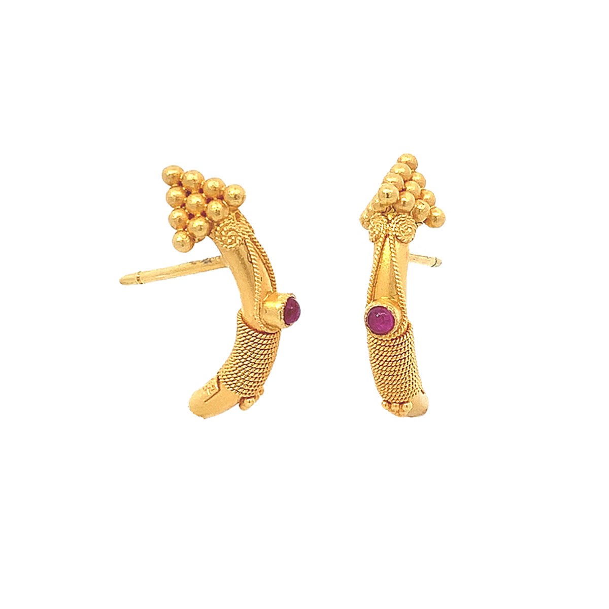 22k yellow gold Vintage half hoops with cabochon rubies and granulated & twisted wire trim