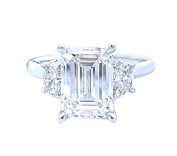 14KW GOLD LAB-GROWN 3-STONE STYLE DIAMOND ENGAGEMENT RING WITH 4.06CT EMERALD CENTER (G/VS1, LG612323789) WITH 0.79CT HALF MOON SIDE DIAMONDS & UNDERBEZEL