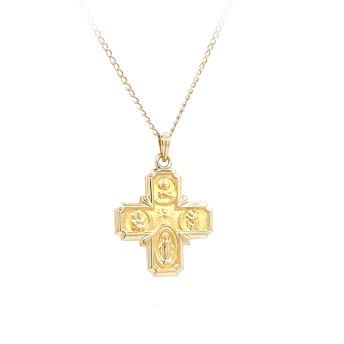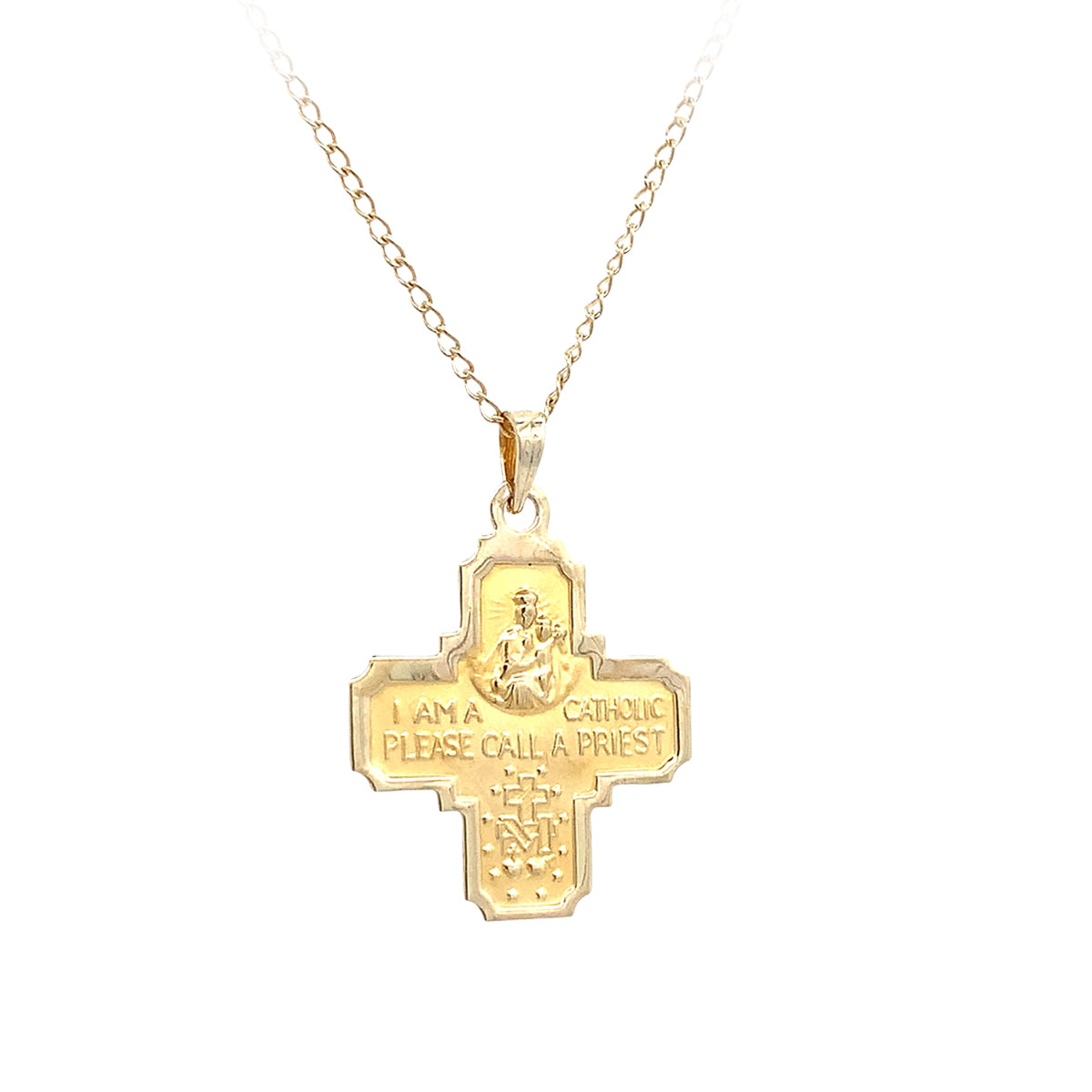 14kt yellow gold 18" Vintage Catholic "4-way" religious medal. On the rear it states, "I am a Catholic. Please call a Priest."