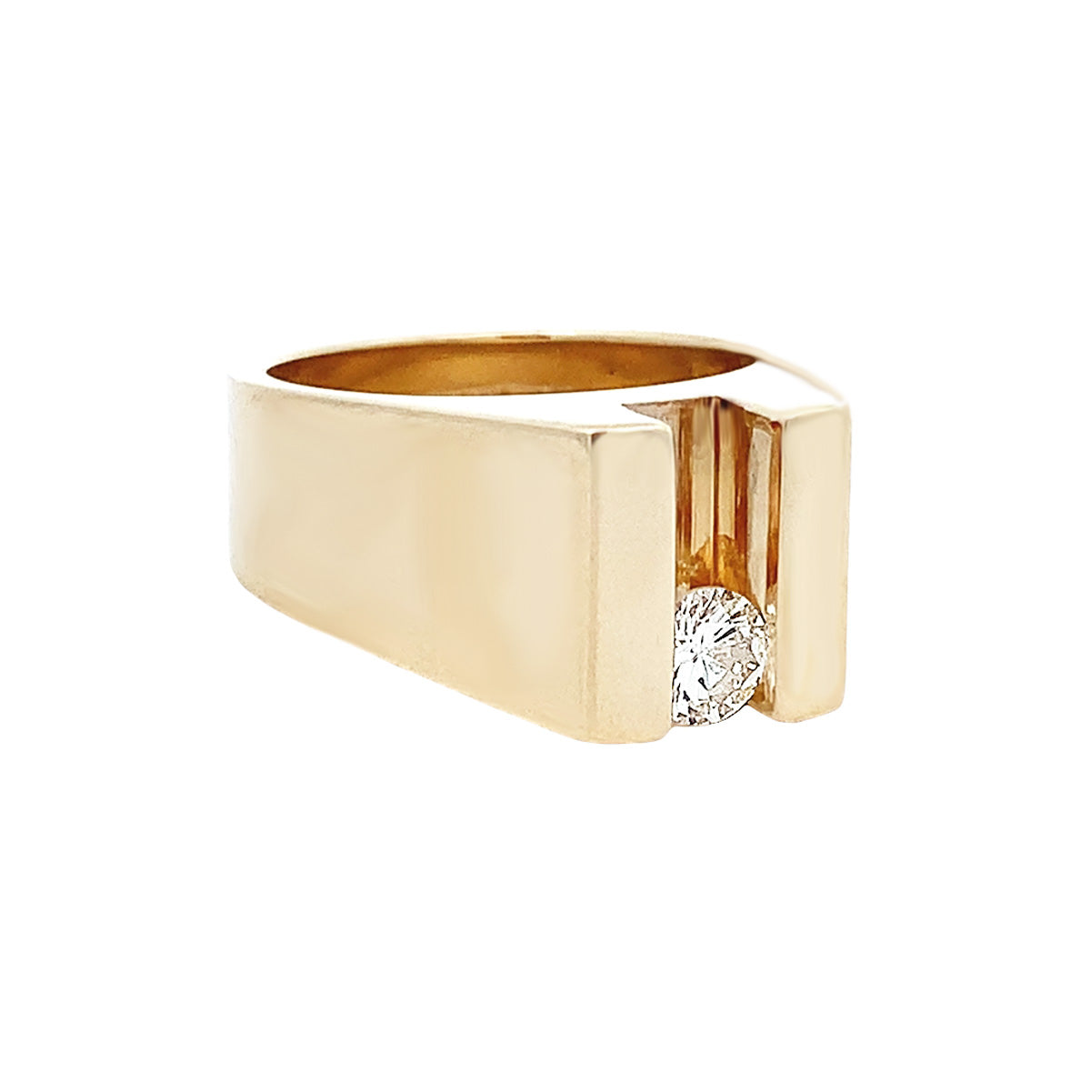 14kt yellow bold gold heavy Vintage ring with 0.37ct floating diamond, size 7. The diamond slides gracefully back and forth in the center "channel" for a unique sense of "movement" in the ring.