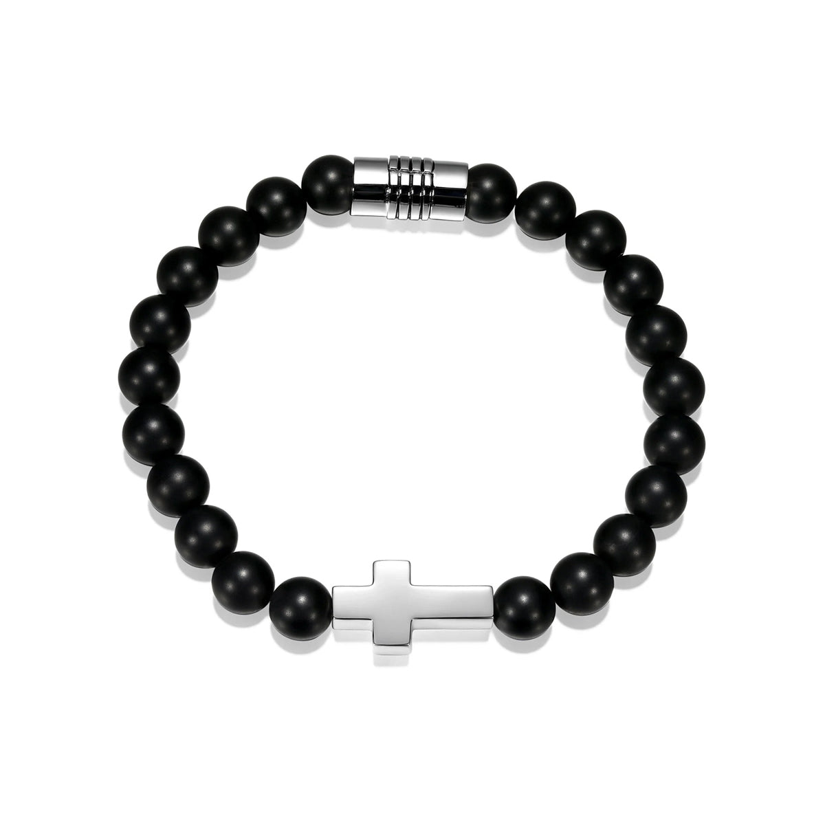 Sterling silver 7.25" matte black agate "Strata" 8mm bead bracelet with cross by Ethos