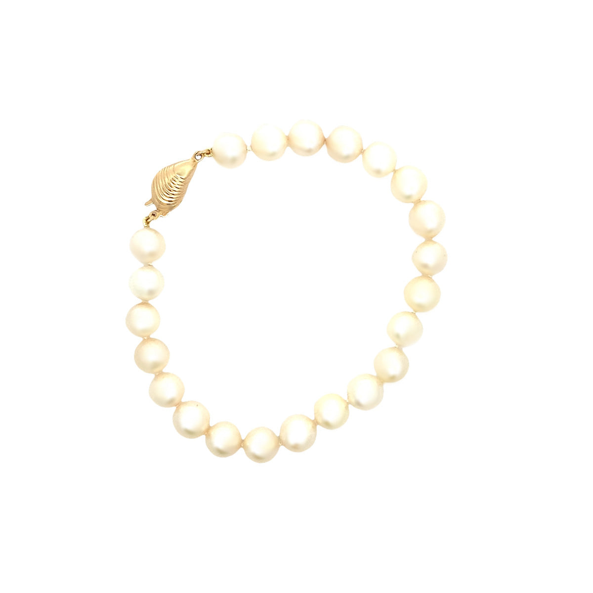 7.5" bracelet of Vintage 7.5mm Akoya light cream colored cultured pearls with a whimsical 14kt yellow gold "Mussel" seashell clasp