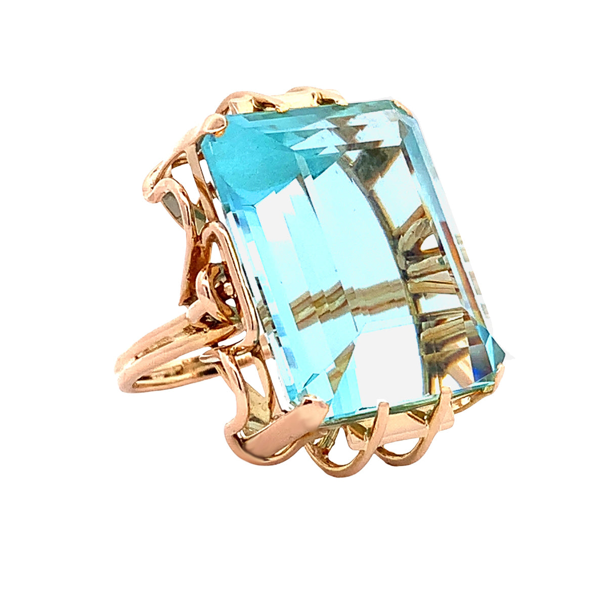 Spectacular 18kt rosy yellow gold large Vintage 38ct aquamarine statement ring