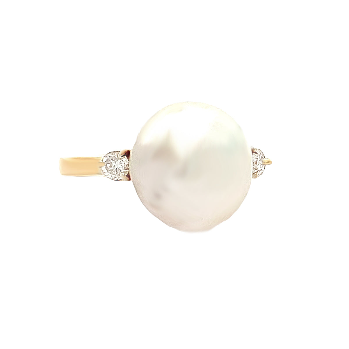 14kt yellow gold Vintage coin pearl & 0.12ct diamond 3-stone ring, size 5