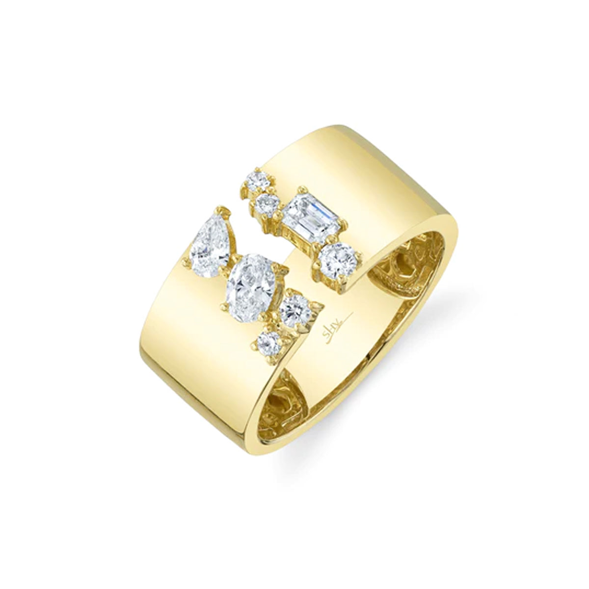 14k yellow gold wide split-top fashion ring with 0.61ct pear, oval, emerald-cut and round diamonds, Size 7