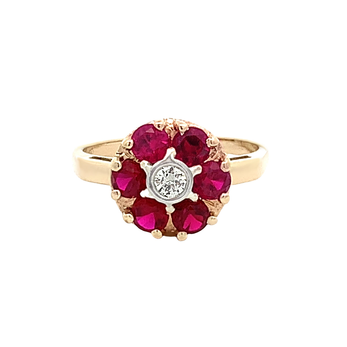 14kt yellow gold Vintage deep red Created ruby & 0.08ct diamond "Flower" ring, size 6.75