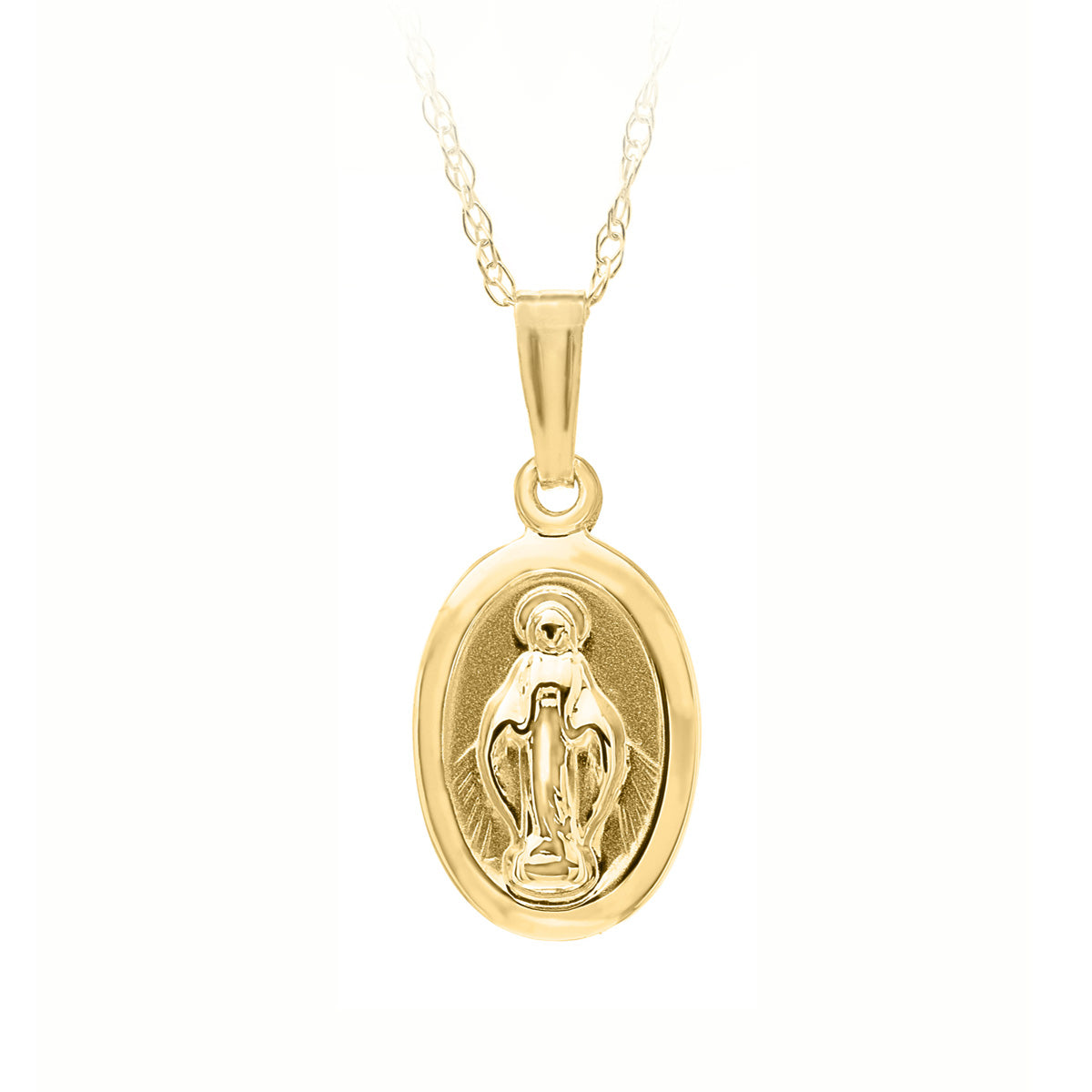 14kt yellow gold small oval miraculous medal on 15" rope chain