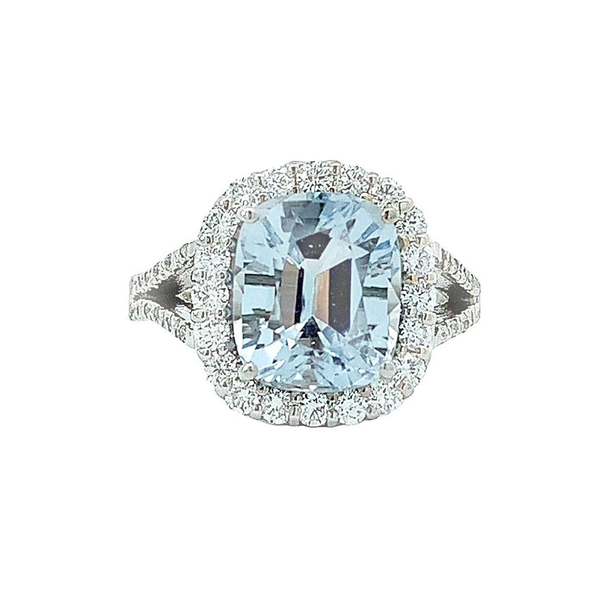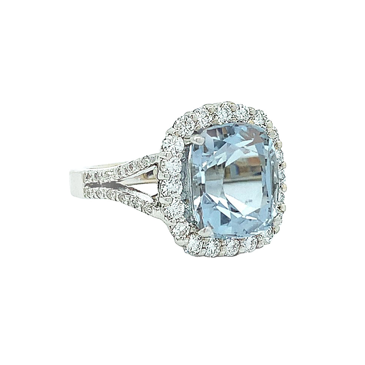 18kw Gold 4.30ct Cushion Aqua &Amp; .70Ct Diamond Halo Ring With Diamond Split Shank, Size 6