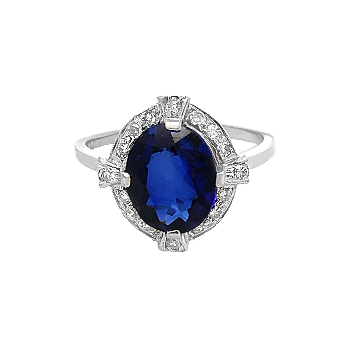 14kt white gold Vintage synthetic sapphire ring with 0.18ct diamond Halo, Size 8.75