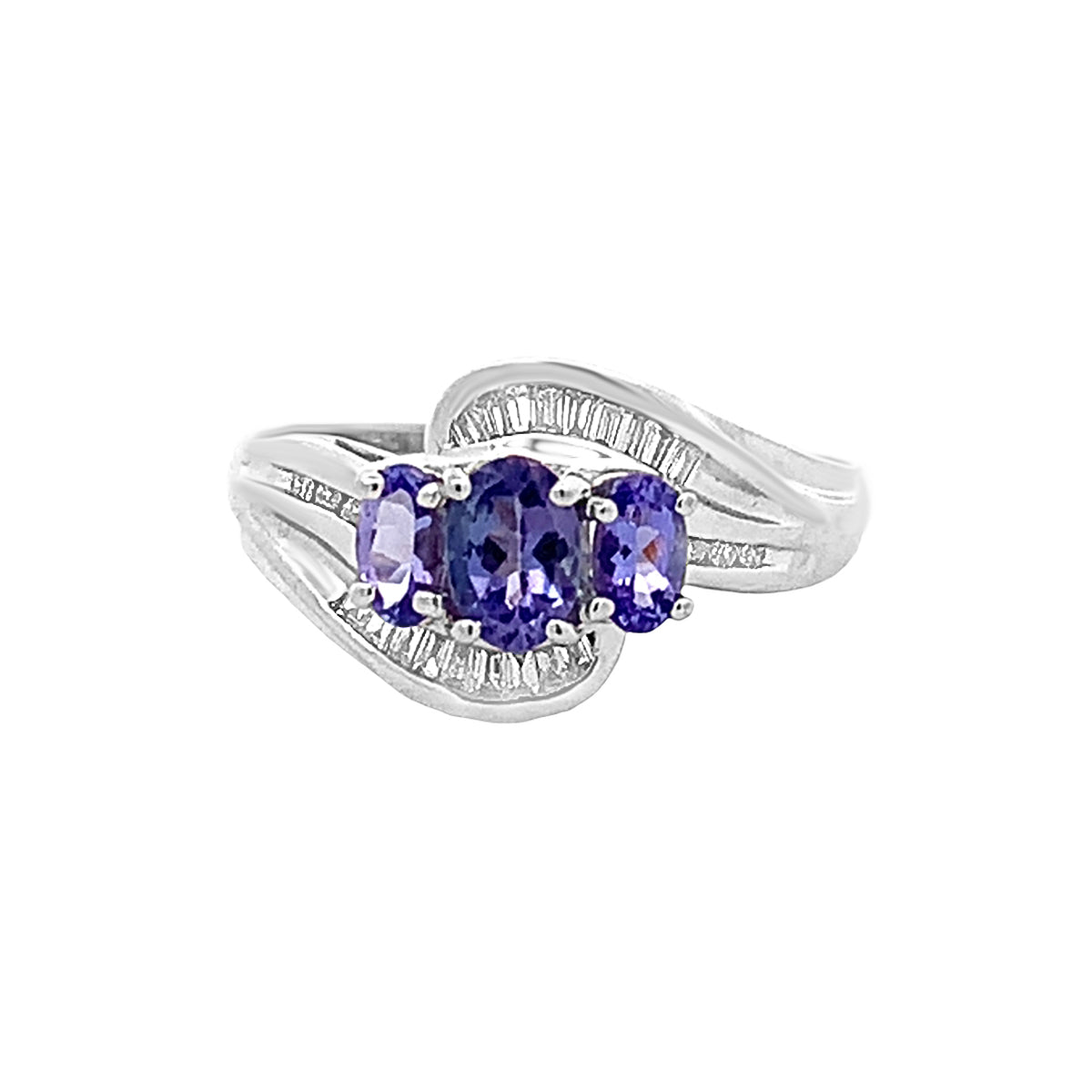 14k white gold Vintage 3-tanzanite bypass ring with 0.22ct baguette diamonds, size 8