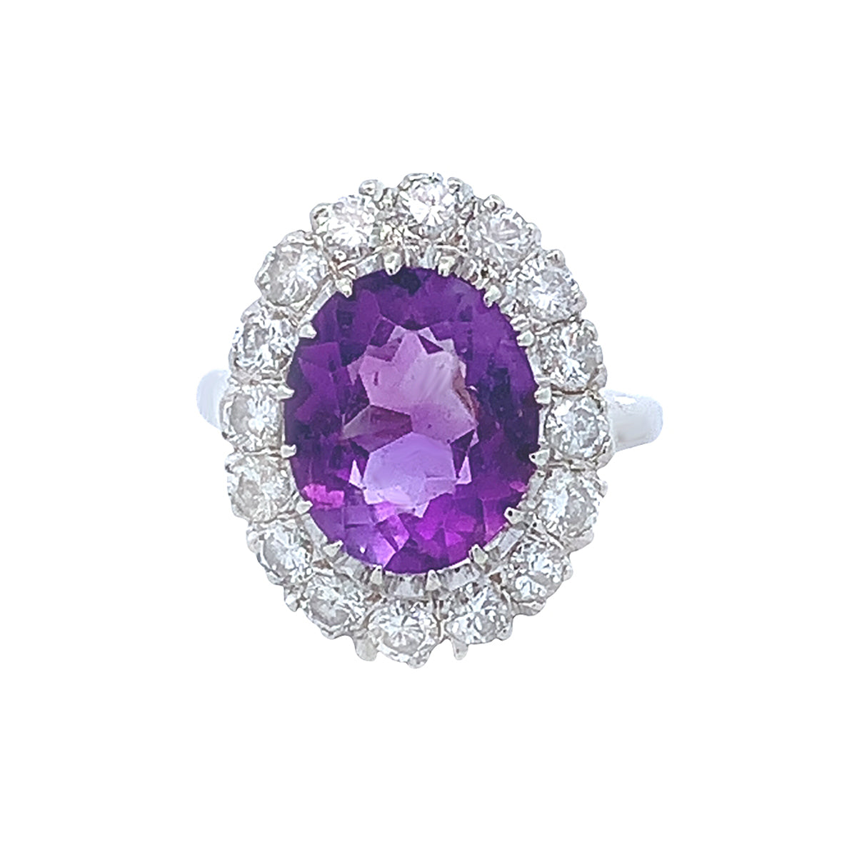 14k white gold oval Vintage amethyst & 1.12ct diamond halo ring, size 6.25
