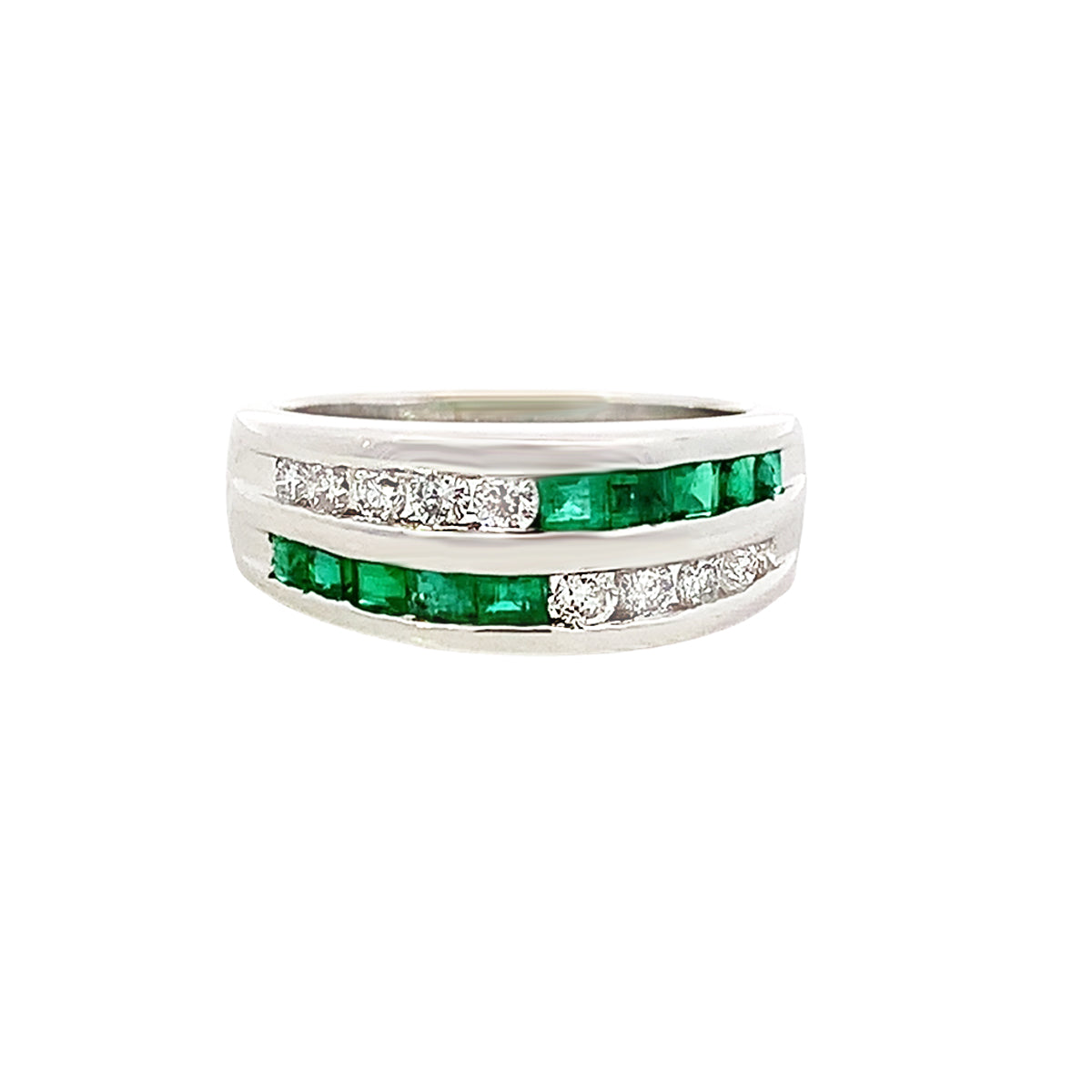 18kt white gold Vintage 2-row emerald & 0.38ct channel-set diamond ring, size 6.5