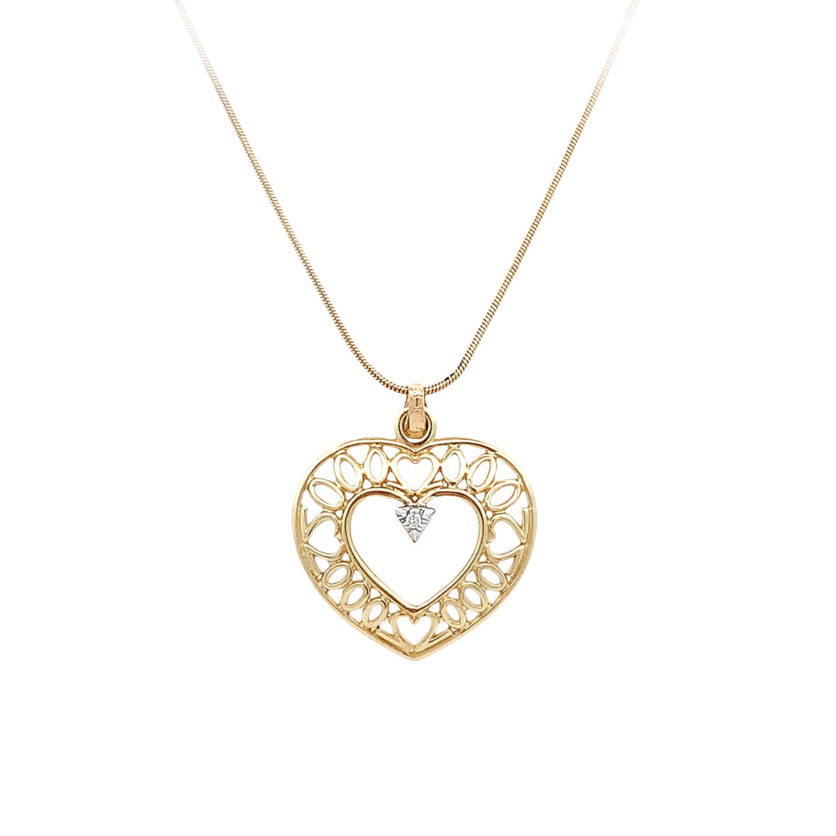 14ky gold 16" Vintage filigree heart pendant with small diamond on snake chain