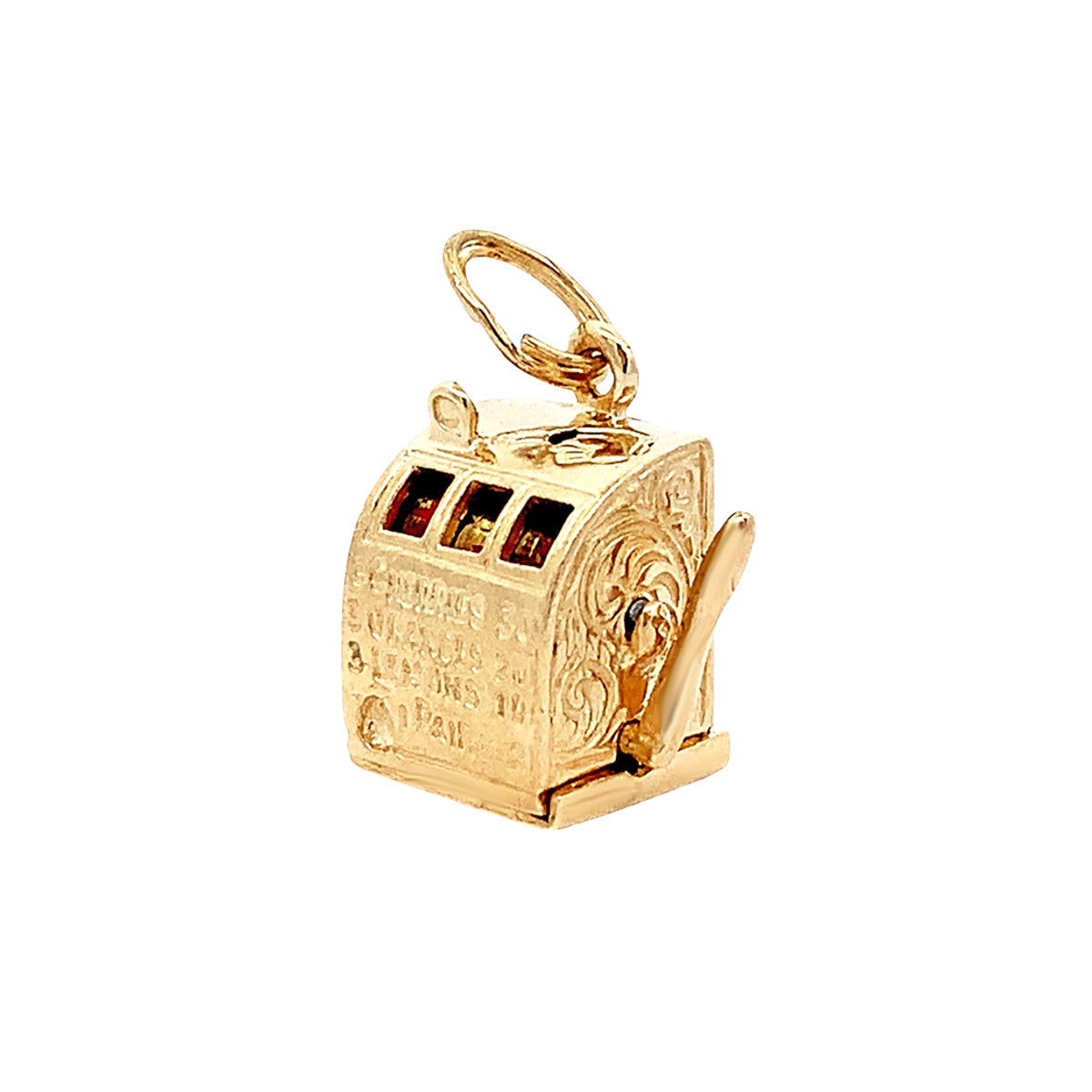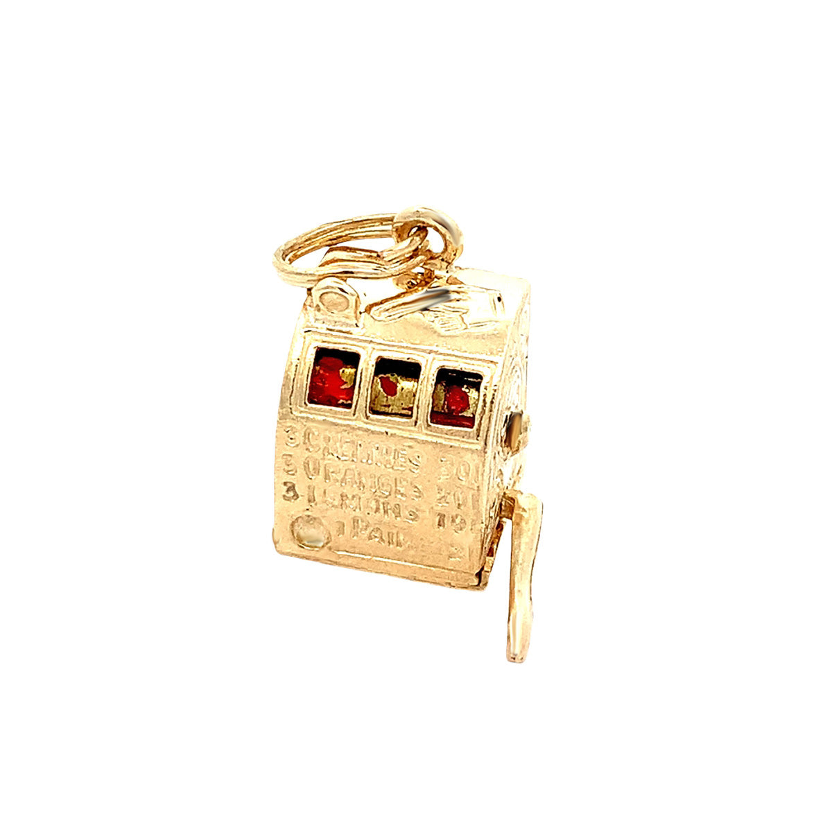 14kt yellow gold heavy, 3-D Vintage slot machine charm for those who like a little "Vegas" in their life! Slot arm pulls down and the reels inside turn to stop at different "fruit" symbols.